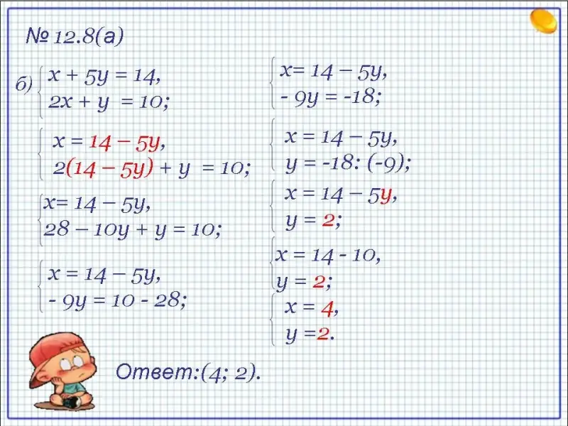 - Подставить найденное на третьем шаге значение x в выражение y через x, полученное на первом шаге.