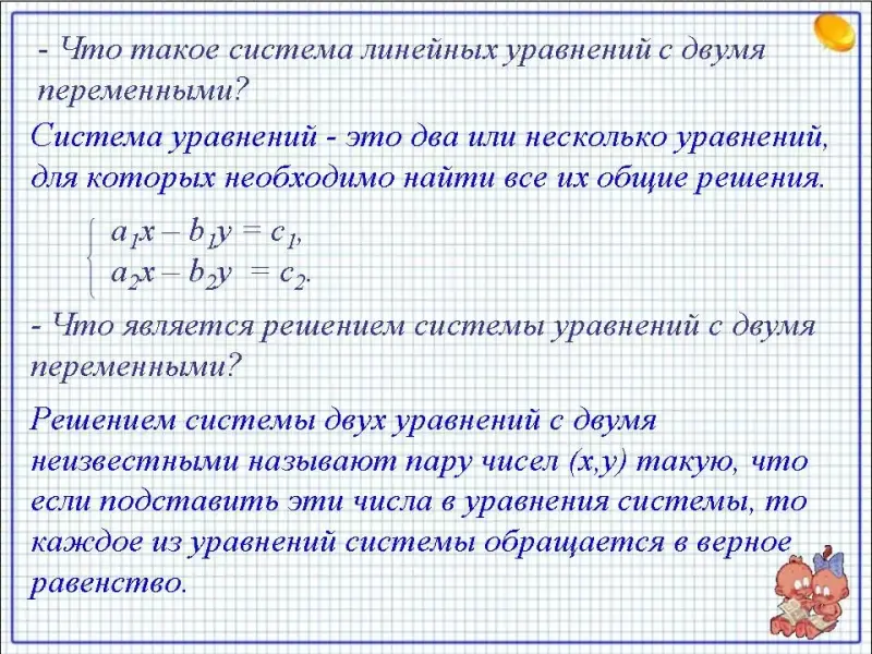 - Знает, что значит решить систему линейных уравнений с двумя переменными;