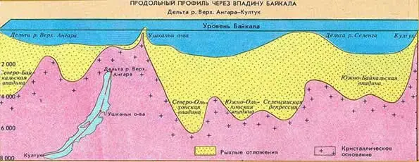 В образовавшуюся трещину миллионы лет заливалась вода, приносимая реками, речушками и ручьями ( всего их сейчас 544, в том числе на восточном берегу - 324). Вода подмывала берега, реки приносили взвеси, которые отлагались на дно впадины. Толщина наносов достигает семи километров. Объем наносов более 46000 кубических километров. Толщина земной коры в трещине не превышает 38-42 км. На глубине 22-24 км находится гипоцентр землетрясений, которые могут достигать 8-9 баллов. Близость горячей мантии порождает на берегах озера десятки горячих источников (около 35 известных). За миллионы лет вода с площади водозабора 588000 кв.км наполняла несколько глубоководных впадин: северную, среднюю и южную, которые со временем слились в одну. Так возникло уникальное озеро Байкал. В нем содержится четверть мировых запасов пресной воды.