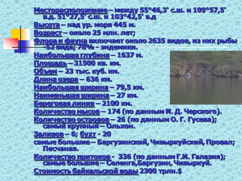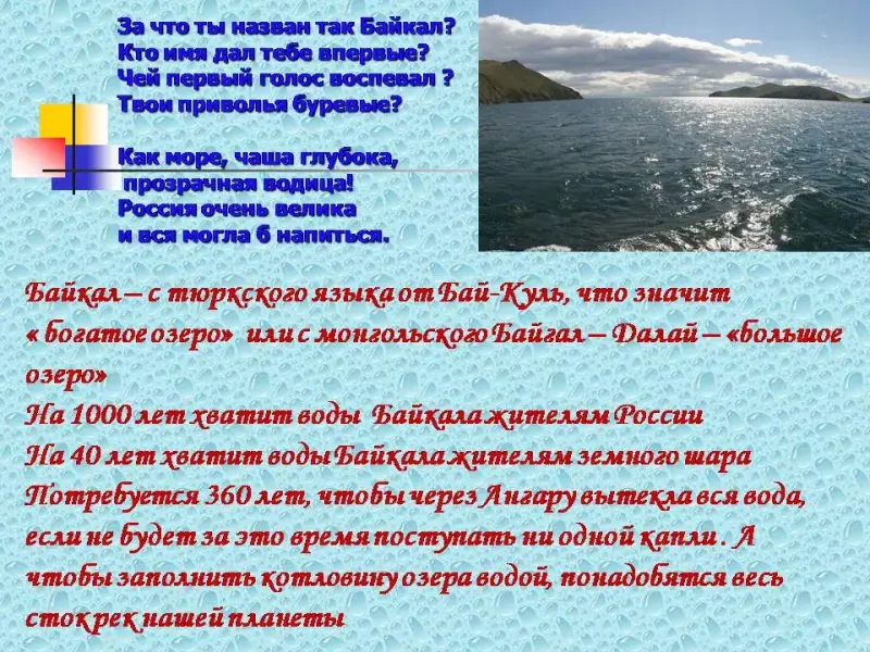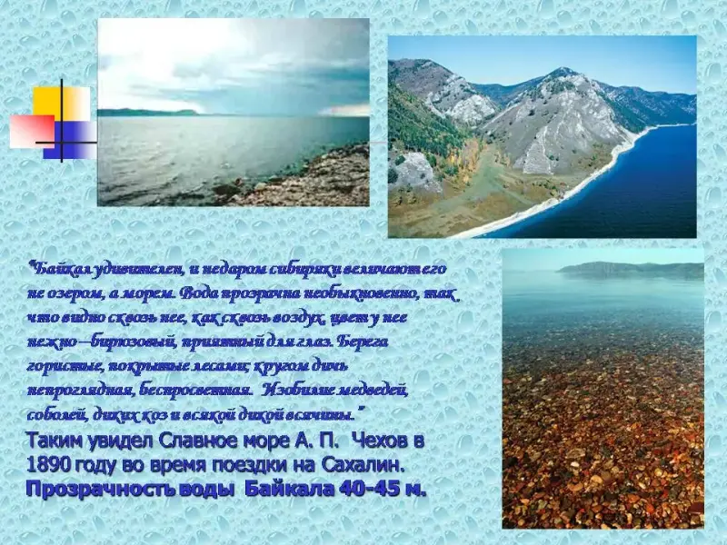 Учитель: Среди заснеженных хребтов на самой окраине Северной Азии лежит это огромное пресноводное озеро. Древнее. Чистое. Самое глубокое в мире. Самое красивое. Одно из величайших озер планеты, колыбель многих племен и народов древности, протянулось по поверхности земли на 636 километров.