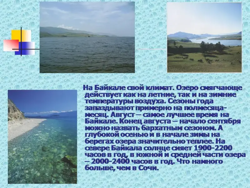 Учитель. Климат озера Байкал и его побережья имеет черты морского климата и значительно отличается от климата окружающей местности. Водные массы озера в летний период прогреваются до глубины 200-250 м и как аккумулятор, накапливают большое количество тепла. Зима на Байкале мягче, а лето - прохладнее, чем на остальной территории Сибири.