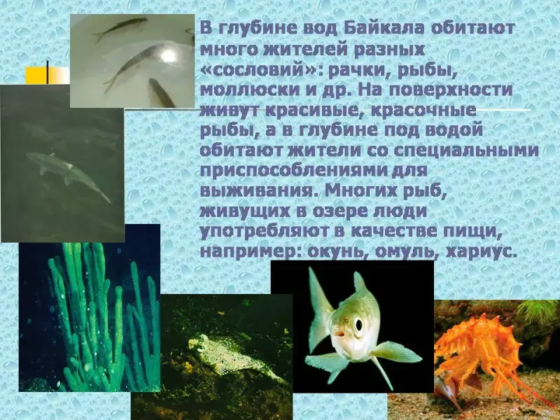 Уч-ся. Байкал - самое чистое на Земле естественное хранилище пресной питьевой воды. Редкая чистота и исключительные свойства байкальской воды обусловлены жизнедеятельностью животного и растительного мира озера. За год армада рачков (эпишура) способна трижды очистить верхний пятидесятиметровый слой воды. В байкальской воде очень мало растворенных и взвешенных минеральных веществ, ничтожно мало органических примесей, много кислорода.