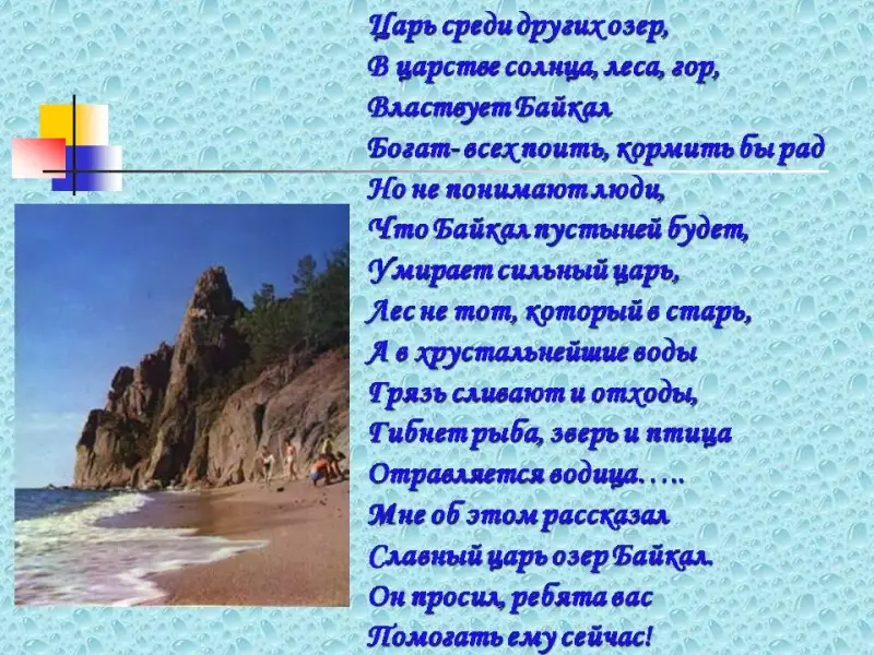 - удовлетворить и развить познавательные возможности учащихся, опираясь на уже имеющиеся у них знания о Байкале;