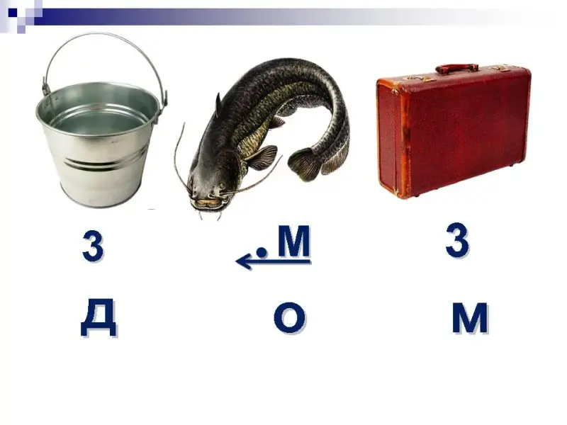 - Перед вами зашифрованные слова. Давайте разгадаем первое слово. Какой третий звук, в слове «ведро»; какой звук перед звуком М в слове «сом»; третий звук в слове «чемодан»? (Слайд 12)