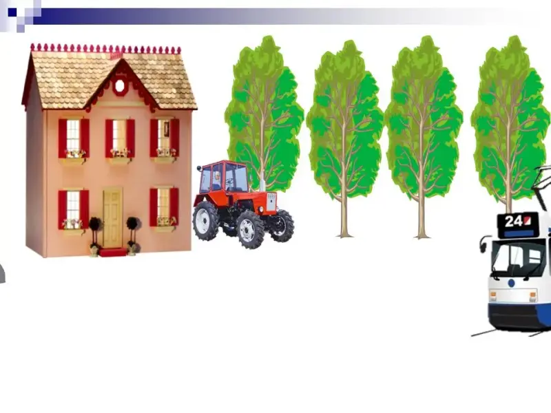 (Автомобиль подъехал к подъезду. Трактор отъехал от дома.) (Слайд 16)