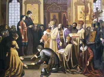 Во многих сочинениях современников описано торжественное венчание на царство Михаила Федоровича. Интересен перечень лиц участвовавших в этом. Ведь именно эти люди окружали царя в первые, самые трудные годы его правления. Венчание состоялось 11 июля в канун именин молодого царя. Священнодействие совершал казанский митрополит Ефрем (это должен был делать патриарх, но его в то время на Руси не было). Корону держал Ф.И. Мстиславский, скипетр - Д.Т. Трубецкой, царскую шапку - дядя царя И.Н. Романов, державу - В.П. Морозов, а за платьем ходили Д.М. Пожарский и казначей Траханиотов[10]. Следовательно, в церемонии главную роль играли представители разных кругов: самый знатный князь, родственники царя, полководцы-освободители, служилый дворянин. Новый царь хотел примирить всех и оказать им честь.