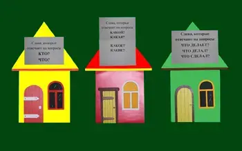 У: Теперь нам нужно оставшиеся слова поселить в 3-й домик. Итак, давайте повторим. В 1-м домике слова, которые отвечают на вопросы…?