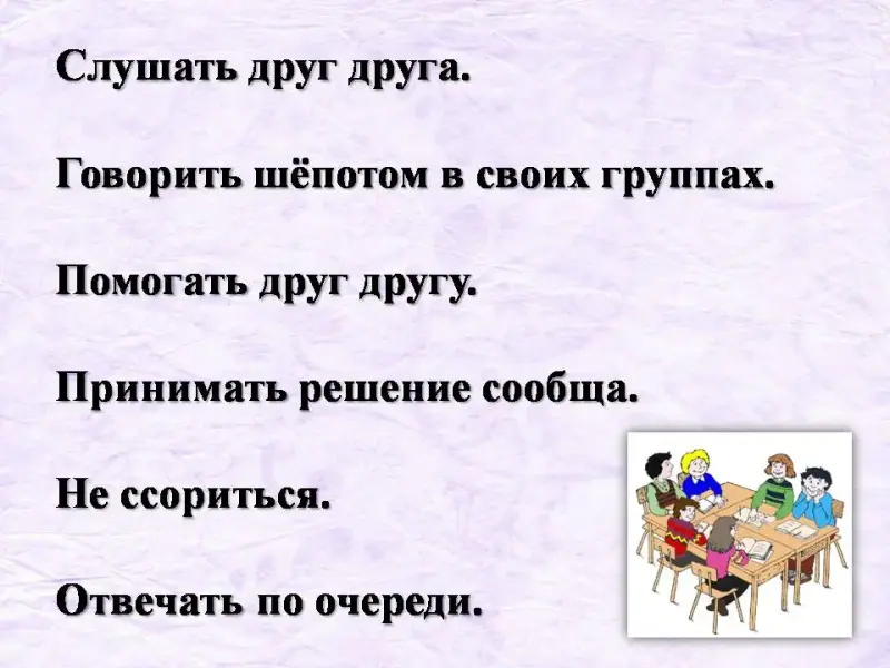 Д: Слушать друг друга, говорить шепотом в своих группах, помогать друг другу, принимать решение сообща, не ссориться, отвечать по очереди. Слайд 3.