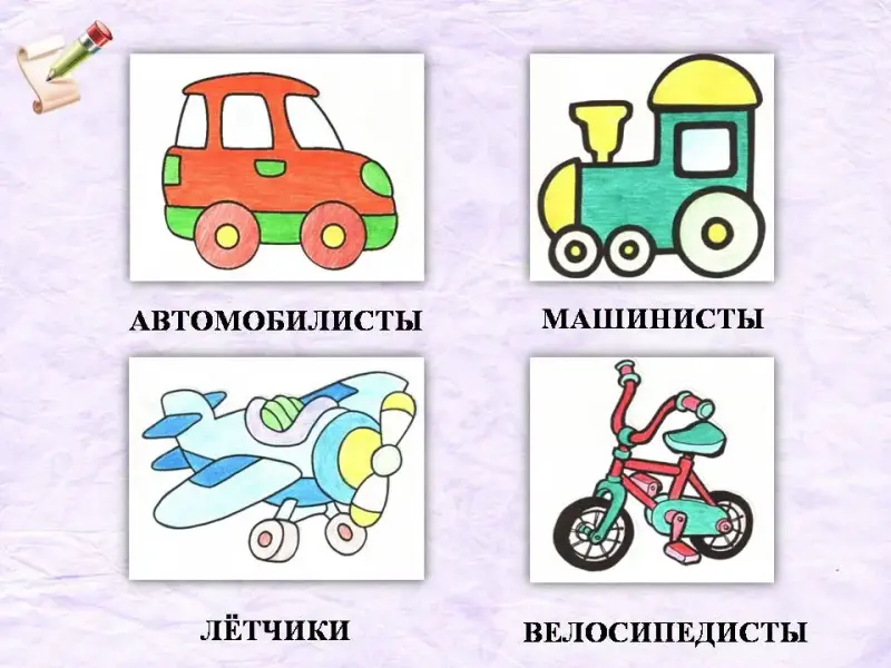 Каждая команда выбирает вид транспорта из предложенного учителем. Выходят по одному из команды и вытягивают табличку (автомобилисты, велосипедисты, машинисты, летчики). Табличка с картинкой, на которой нарисован вид транспорта и написано название команды, выставляется на стол к группе. Слайд 9.