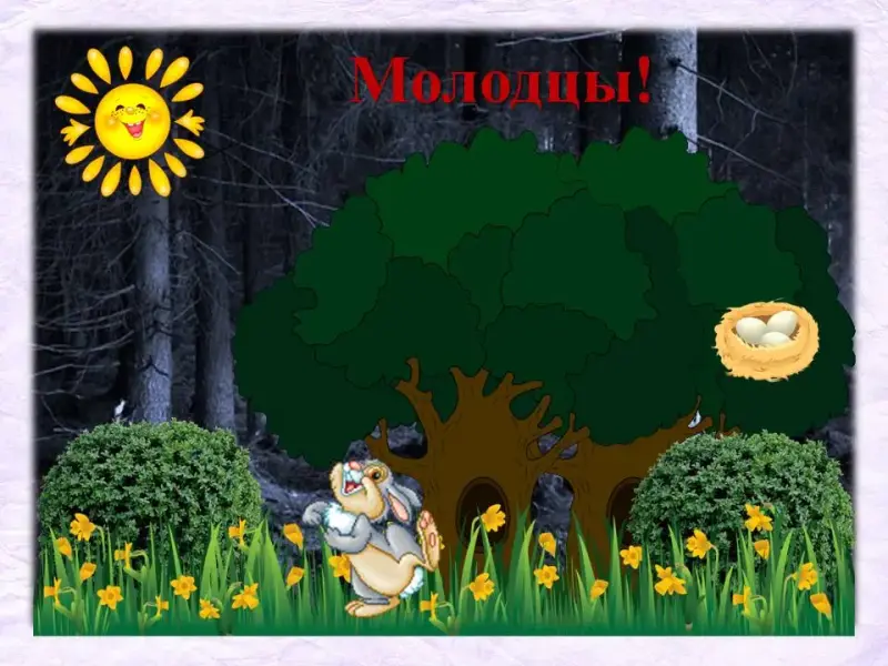 У: Отлично! Посмотрите, какой лес стал красивый! (Учитель убирает тёмные цвета с изображения леса).