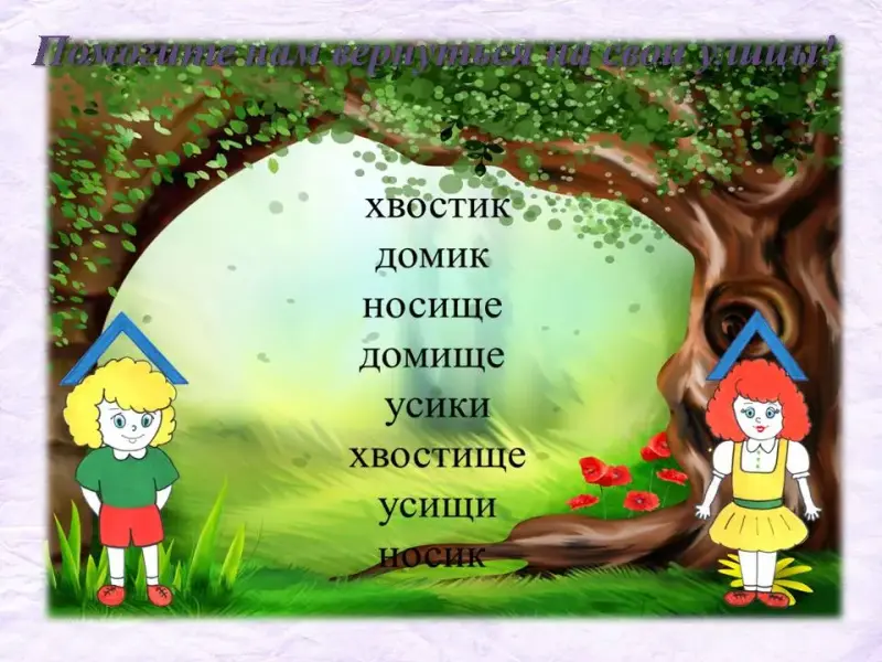 У: Не успели мы выйти из леса, к нам навстречу выбежали слова. Слайд 34. Наверное, им тоже нужна наша помощь. Давайте их прочитаем (хвостик, домик, носище, домище, усики, хвостище, усищи, носик). Куда мы с вами пришли?