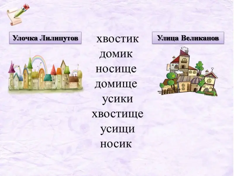 Выберите слова с уменьшительно-ласкательным суффиксом, но помните: сначала выдели (окончание) корень в словах, а затем суффикс: