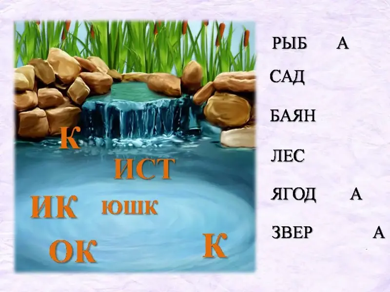 У: Мы пришли к озеру. Наши суффиксы спрятались от Злой Колдуньи. Вам нужно выловить из озера суффикс, при помощи которого можно образовать новое слово. Слайд 39.