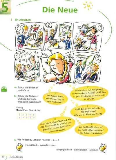- Es war Donnerstag. Alle Schüler sassen in der Klasse. Da kam ein Mädchen und fragte: "Ist hier Klasse 7b?" "Ja", sagte Sofia, "und wer bist du? Bist du neu hier?" "Ja, ich heisse Maria", antwortete das Mädchen. "Ich bin Sofia. Komm, wir haben hier noch Platz".