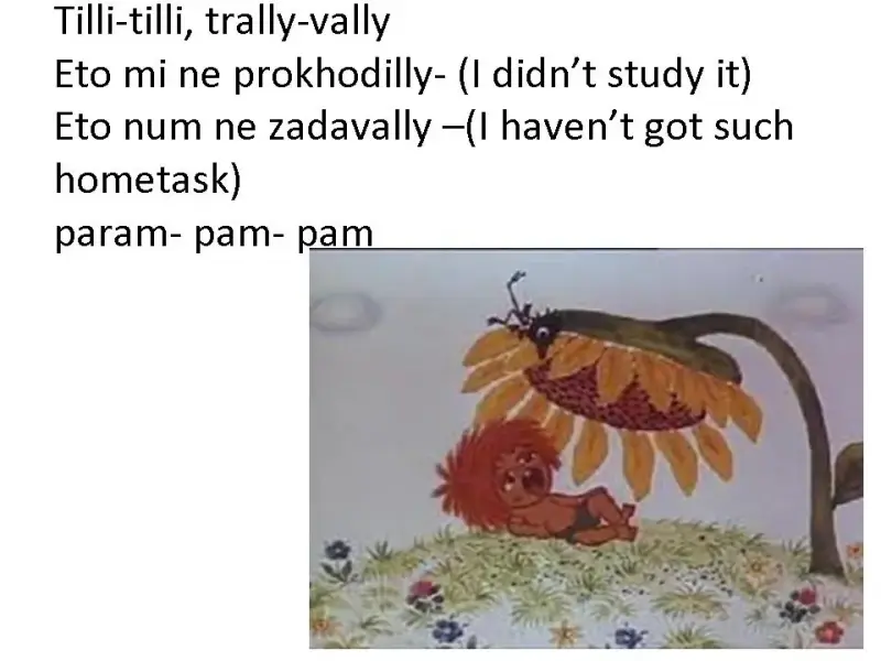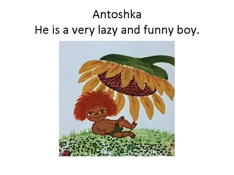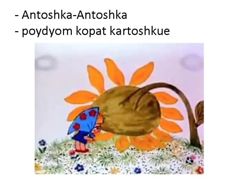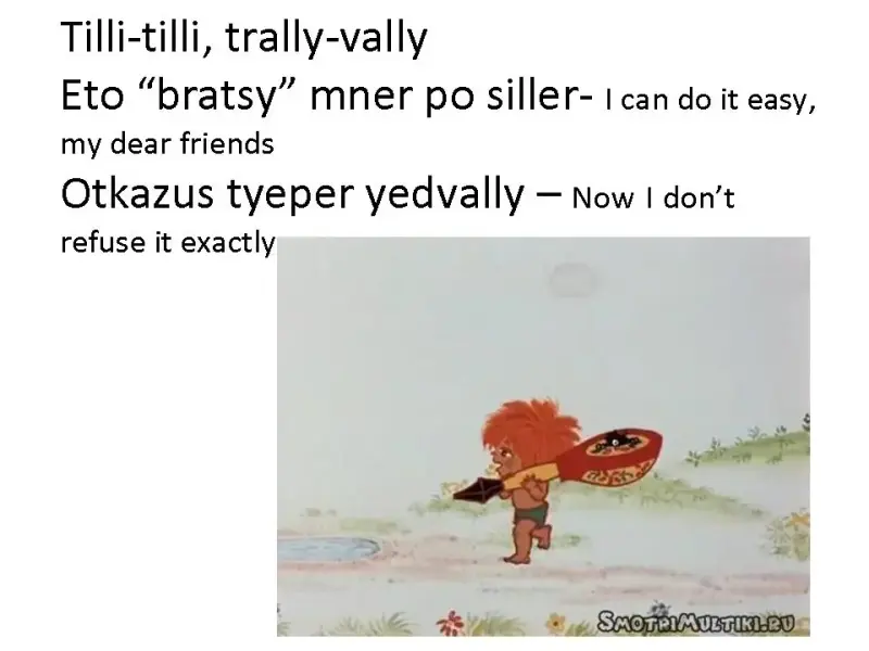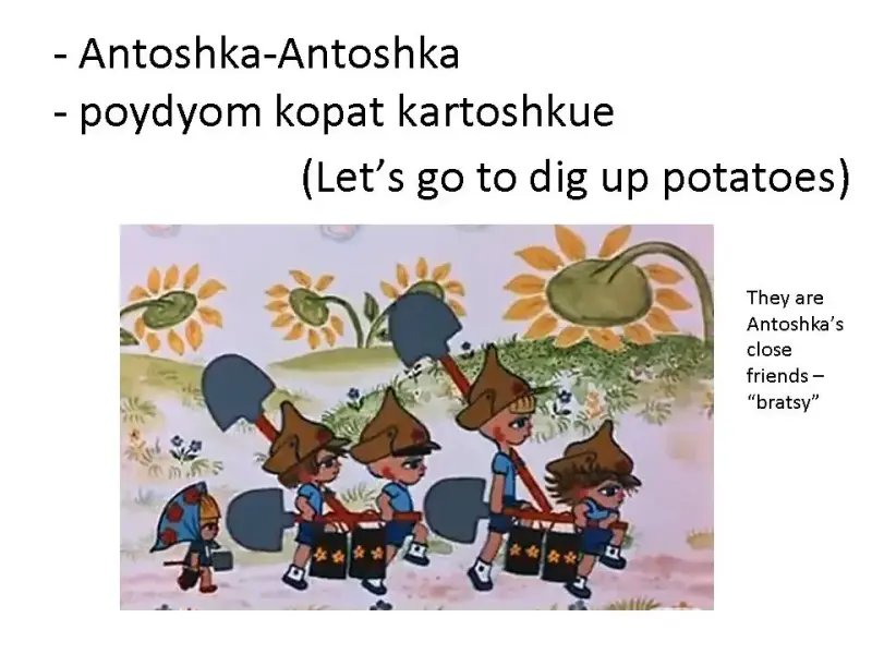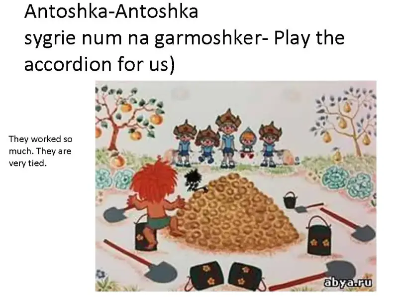 Чтобы заинтересовать шотландских школьников в общении с русскими детьми, необходимо было очень хорошо подготовиться. А именно, использовать весь свой накопленный опыт и знания. Я подготовила для разучивания с шотландскими детьми смешную русскую песенку «Антошка», наглядную презентацию со значением русских фраз и слов из песни (презентация 1), мультфильм «Антошка» (1969, режиссер - Леонид Носырев, композитор - Владимир Шаинский, автор песни - Юрий Энтин), игрушечные атрибуты этой песенки: лопатки, деревянную расписную ложку и музыкальный инструмент- гармошку и подобрала музыкальное сопровождение.