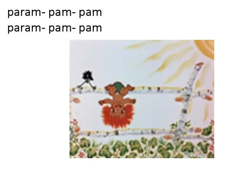 Когда дети разучивали песню Красной шапочки на другом уроке, я мимикой показывала те действия, о которых в ней пелось. Это было понятно и выглядело как веселый танец. Танец не давал детям переутомиться во время разучивания слов и способствовал быстрому их запоминанию.