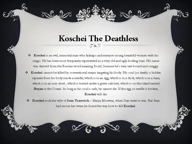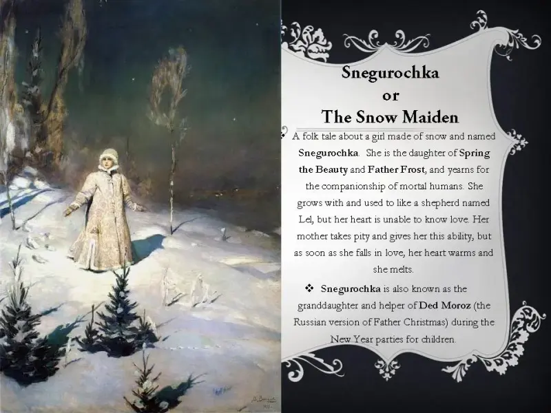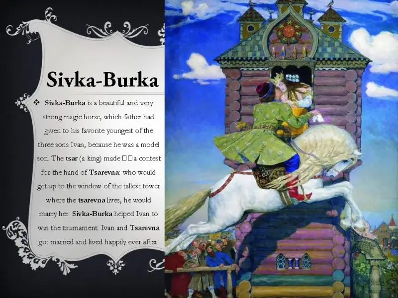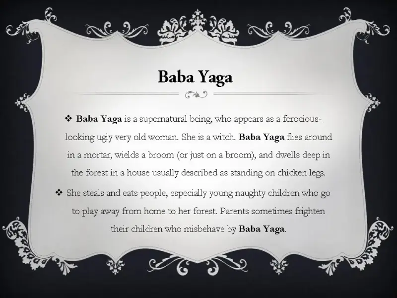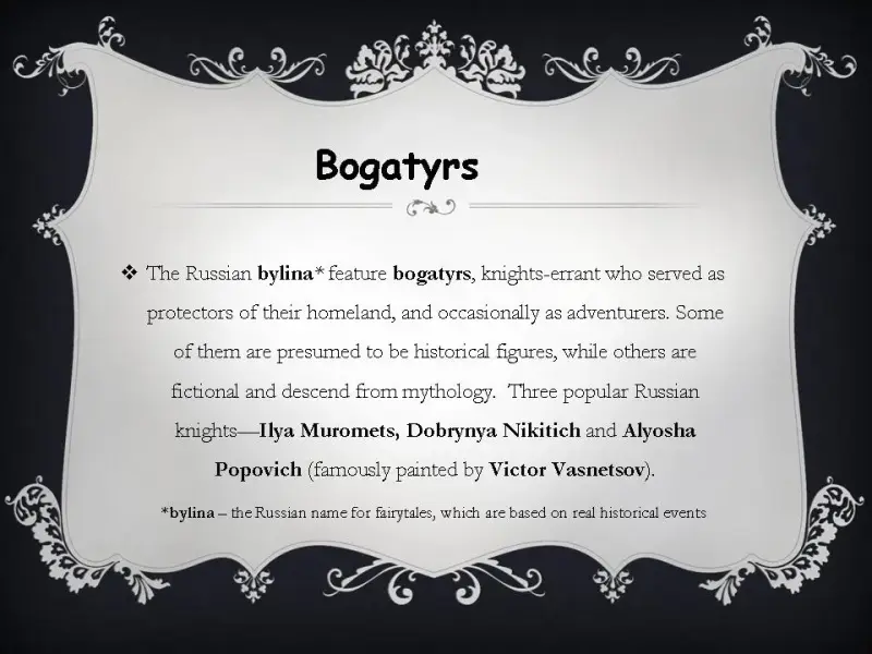 Для детей постарше я приготовила красочную презентацию о сказочных героях русских народных сказок: о богатырях, о Кощее Бессмертном и о бабе-яге и другие (презентация 3).