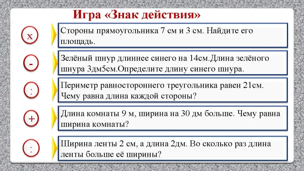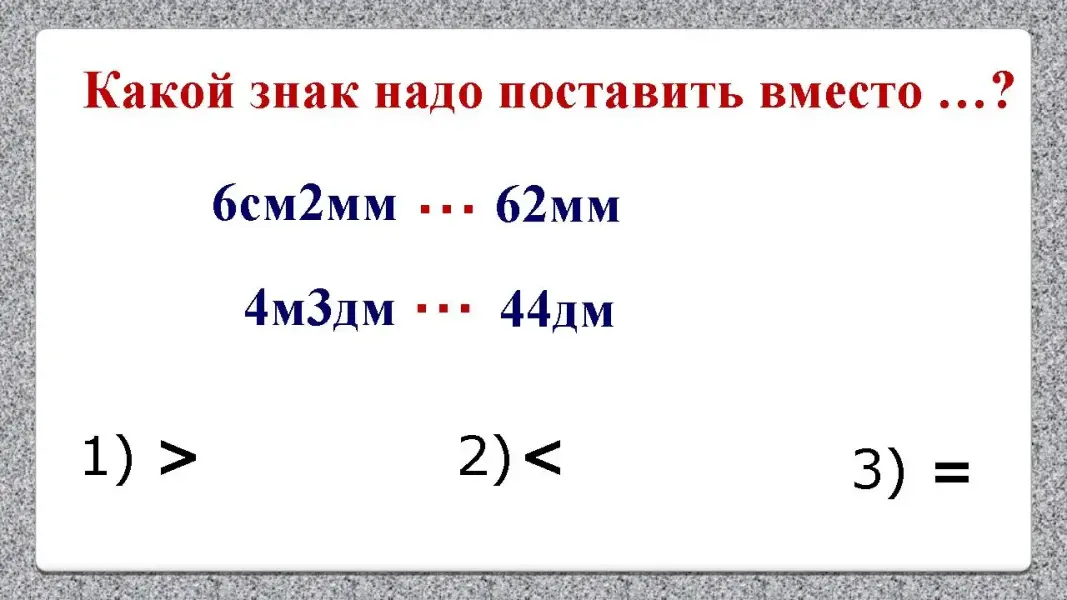 Учитель: В первой строке вы видите 3 линейные величины. Разгадай правило, по которому записан первый ряд величин и продолжите его. Что нужно сделать, чтобы было удобно сравнивать?