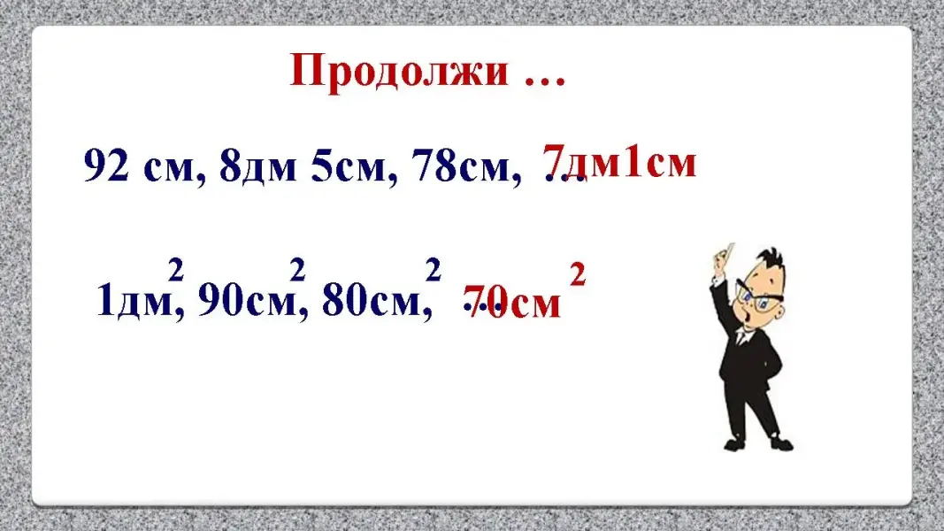 Ученик: Каждая следующая величина уменьшается на 10 см2. Значит, следующая единица будет 70 см2