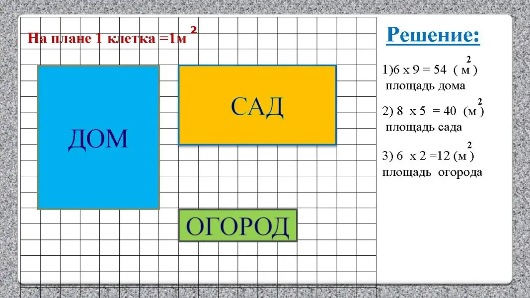 Учитель: При измерении площади дома, комнаты, сада, огорода используется мерка 1 м2 Большие площади комнат, квартир на бумаге изображают в уменьшенном виде.