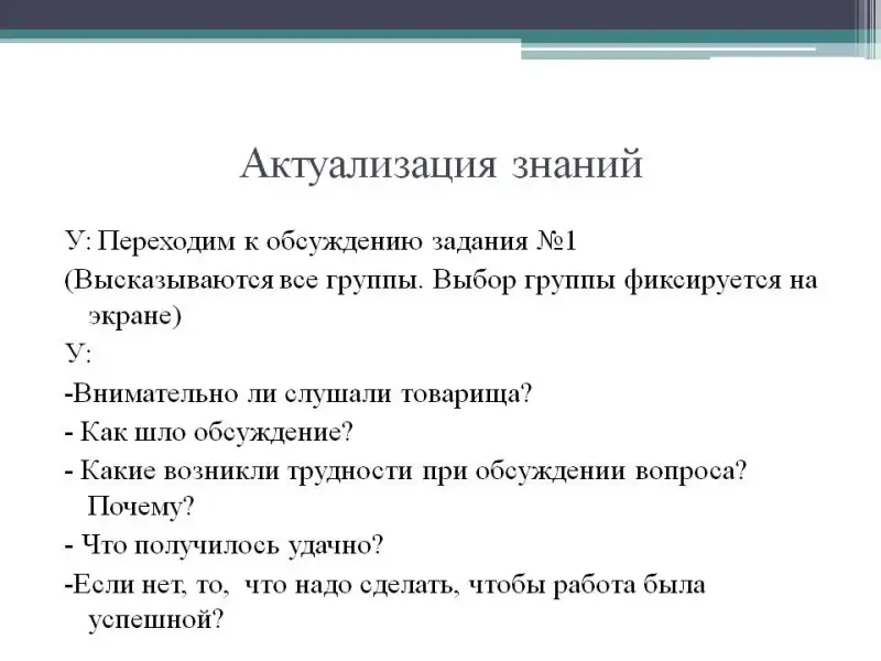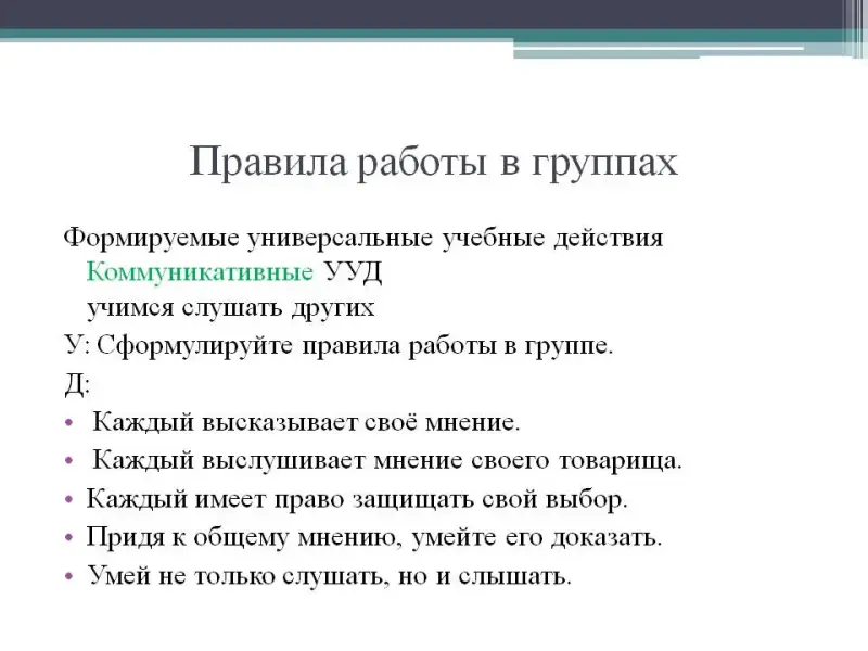 Принятие собственного решения. Каждый ученик получает карточку с заданием. В задании вопрос и несколько вариантов ответов (обычно 3). Правильным может быть 1, 2, а то и все 3 варианта. Выбор скрывает возможные типичные ошибки учащихся. Перед тем как приступить к работе, дети проговаривают "правила", которые помогут им организовать диалог. Проговаривание их в громкой речи создает установку на участие всех детей. Анализирую задания, учащиеся определяют, какие знания имеются для решения поставленной задачи, какие знания необходимо добыть.