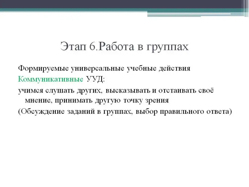 Важным моментом этого этапа является принятие группового решения. Учащиеся высказывают и обосновывают свою точку зрения, учатся слушать и слышать других, договариваться и приходить к общему решению.
