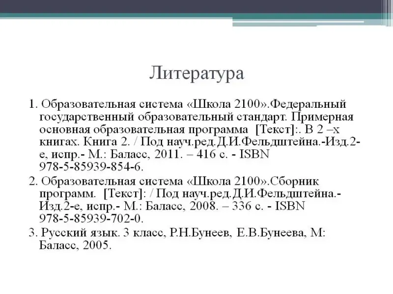 2. Образовательная система «Школа 2100».Сборник программ. [Текст]: / Под науч.ред.Д.И.Фельдштейна.-Изд.2-е, испр.- М.: Баласс, 2008. - 336 с. - ISBN 978-5-85939‑-702-0.