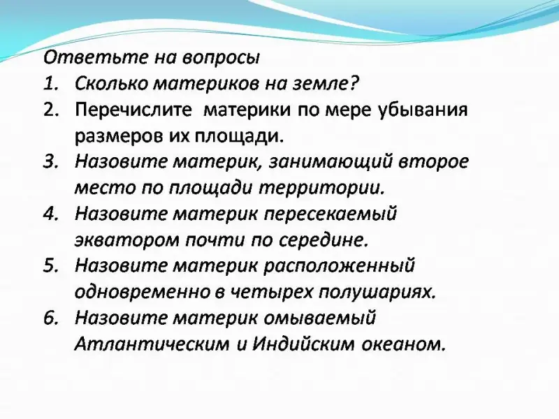 - перечислите материки по мере убывания размеров их площади (Евразия, Африка, Северная Америка, Южная Америка, Антарктида, Австралия);