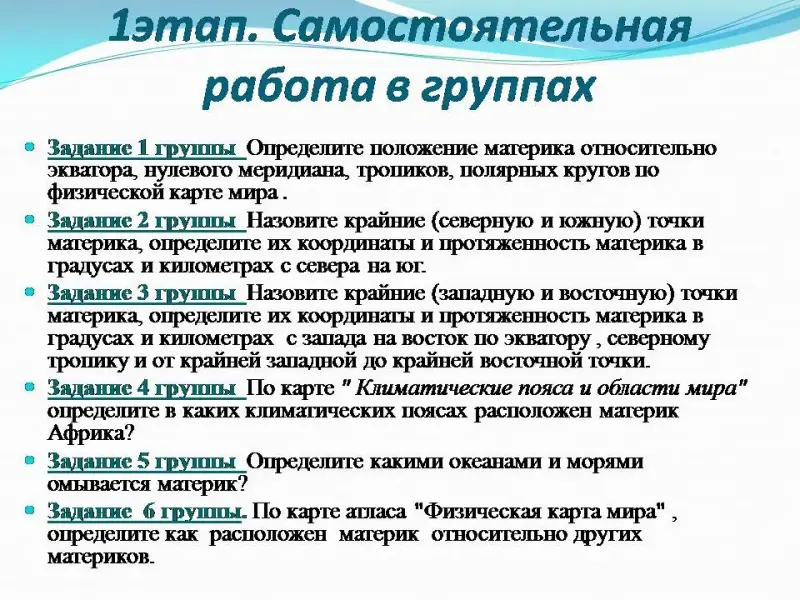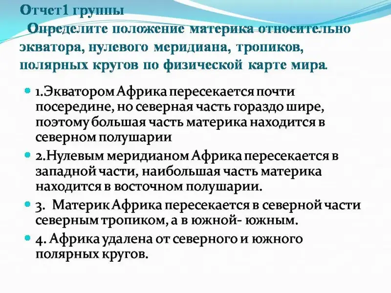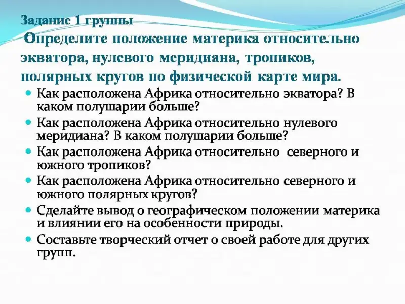 Задание 1 группы. Определите положение материка относительно экватора, нулевого меридиана, тропиков, полярных кругов по физической карте мира (атлас, с. 2-3).