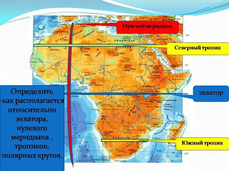 Нулевым меридианом Африка пересекается в западной части, наибольшая часть материка находится в восточном полушарии. -