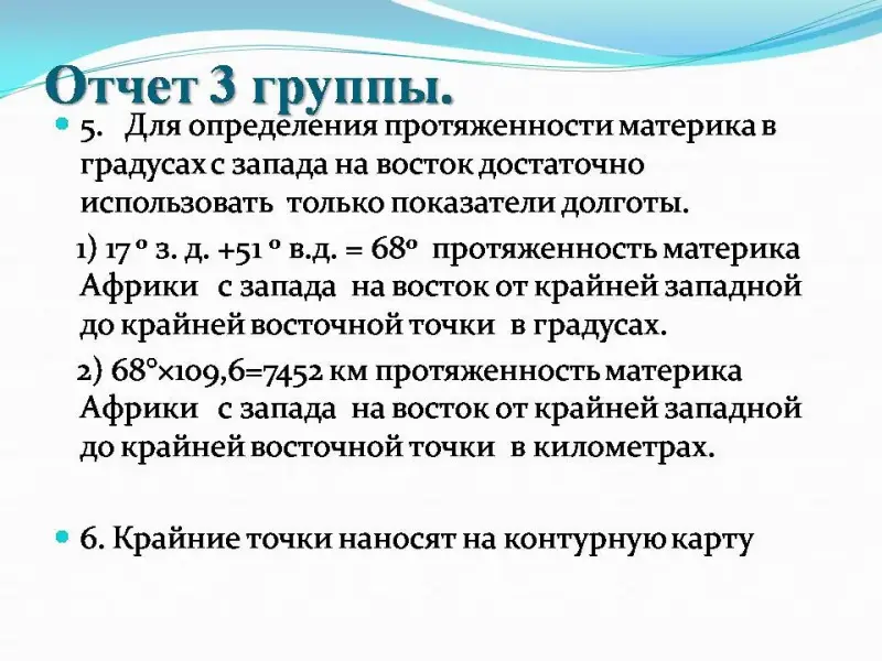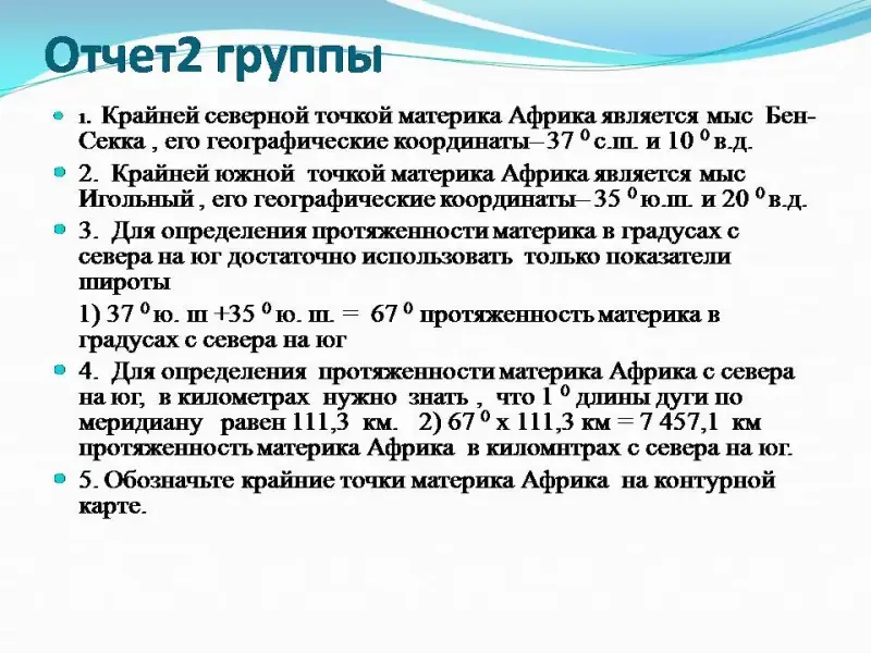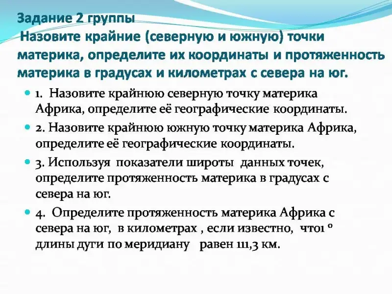 Задание 2 группы Назовите крайние (северную и южную) точки материка, определите их координаты и протяженность материка в градусах и километрах с севера на юг.