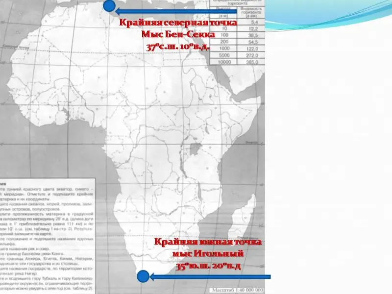 - Назовите крайнюю южную точку материка Африка, определите её географические координаты.