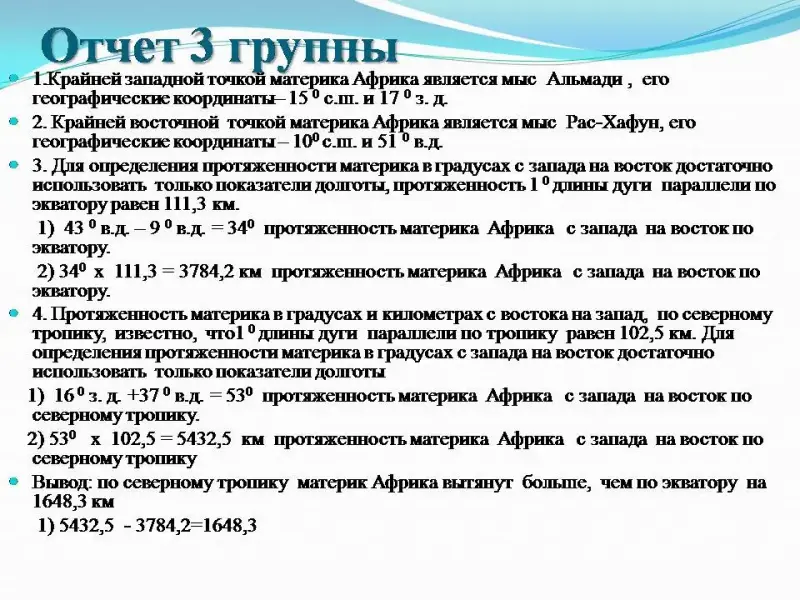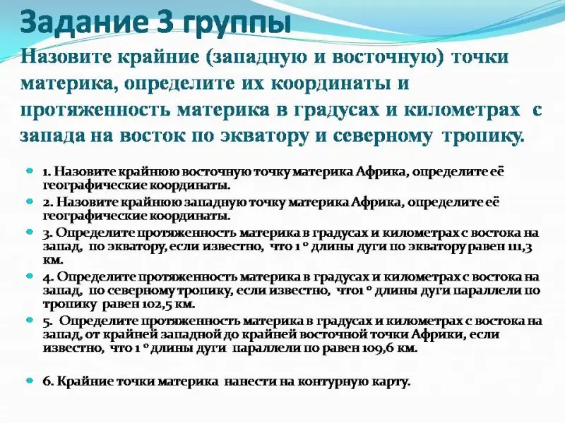 Задание 3 группы Назовите крайние (западную и восточную) точки материка, определите их координаты и протяженность материка в градусах и километрах с запада на восток по экватору и северному тропику.