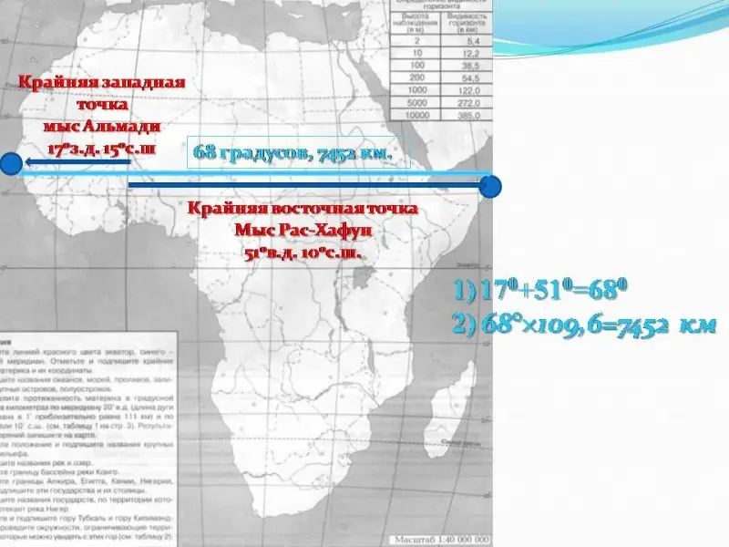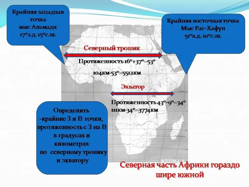 - Определите протяженность материка в градусах и километрах с запада на восток, от крайней западной до крайней восточной точки Африки, если известно, что 1° длины дуги параллели по равен 109,6 км.