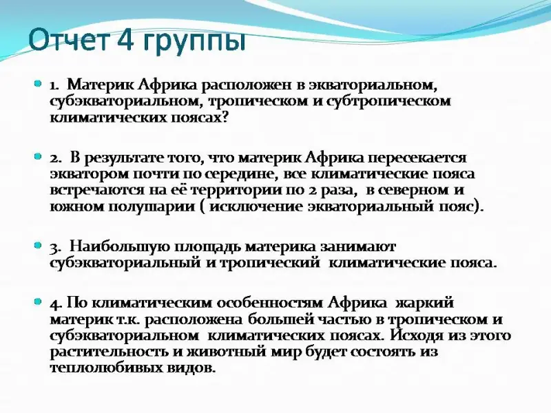 - Исходя из полученных данных , сделайте прогноз о природе материка Африка?