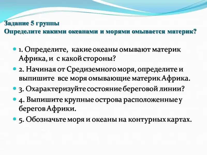 Задание 5 группы Определите, какими океанами и морями омывается материк?