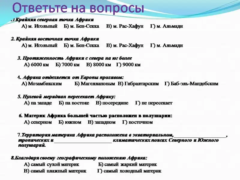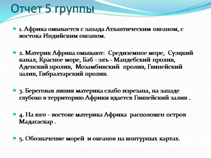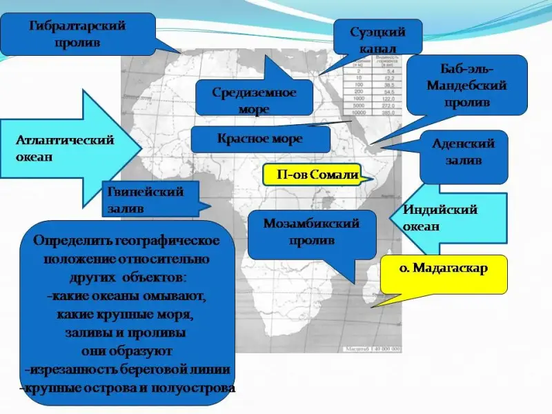 Материк Африка омывают: Средиземное море, Суэцкий канал, Красное море, Баб-элъ-Мандебский пролив, Аденский пролив, Мозамбикский пролив, Гвинейский залив, Гибралтарский пролив. -