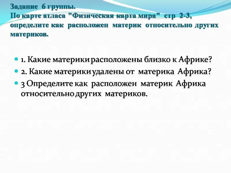 Задание 6 группы. По карте атласа "Физическая карта мира" стр 2-3, определите как расположен материк относительно других материков.