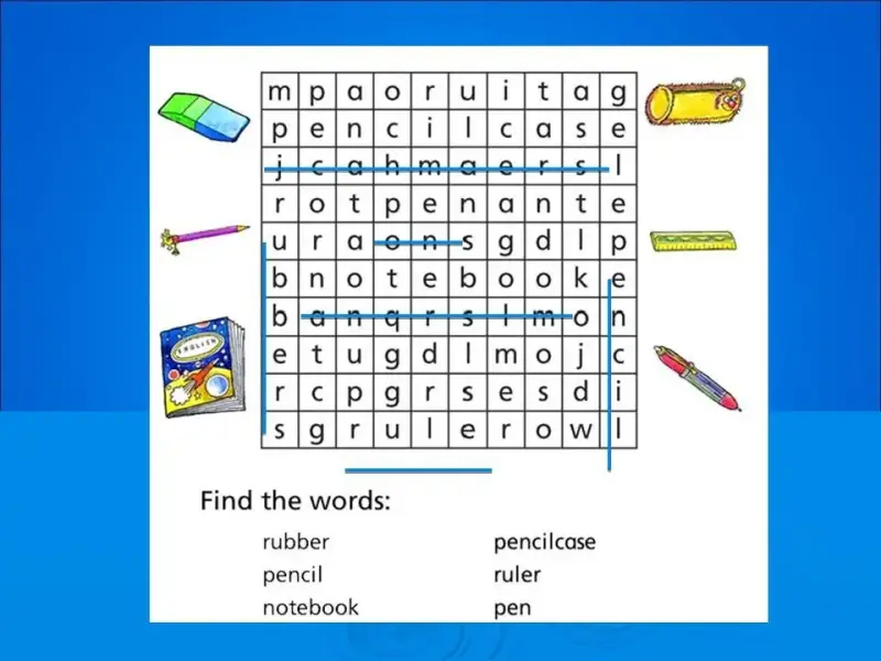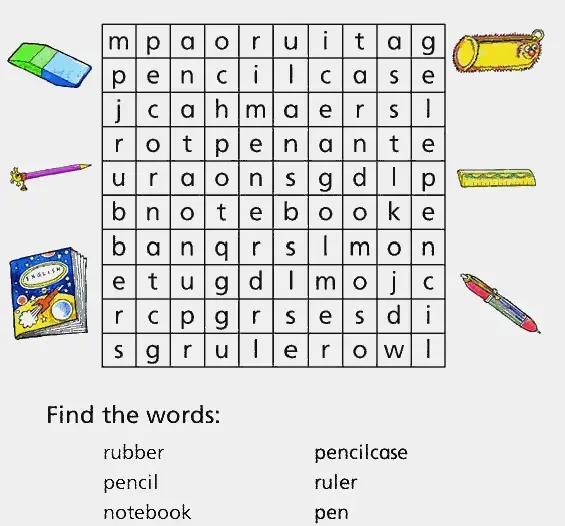 Найдите слова: rubber, pencil, notebook, pencilcase, ruler, pen