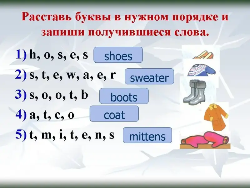 Задание 2. Расставь буквы в нужном порядке и запиши получившиеся слова. (Слайд 7)