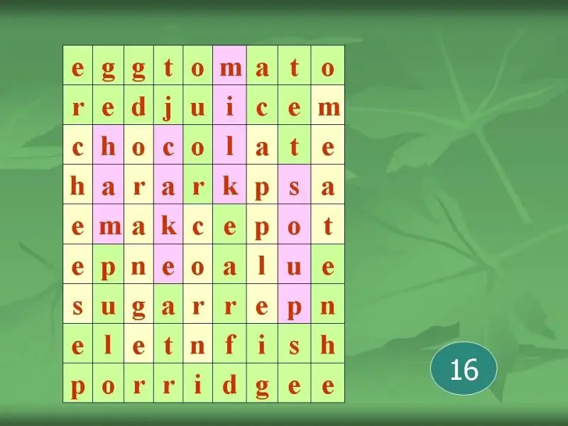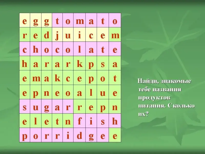 Задание 1. Найди, знакомые тебе названия продуктов питания. Сколько их? (Слайд 15)