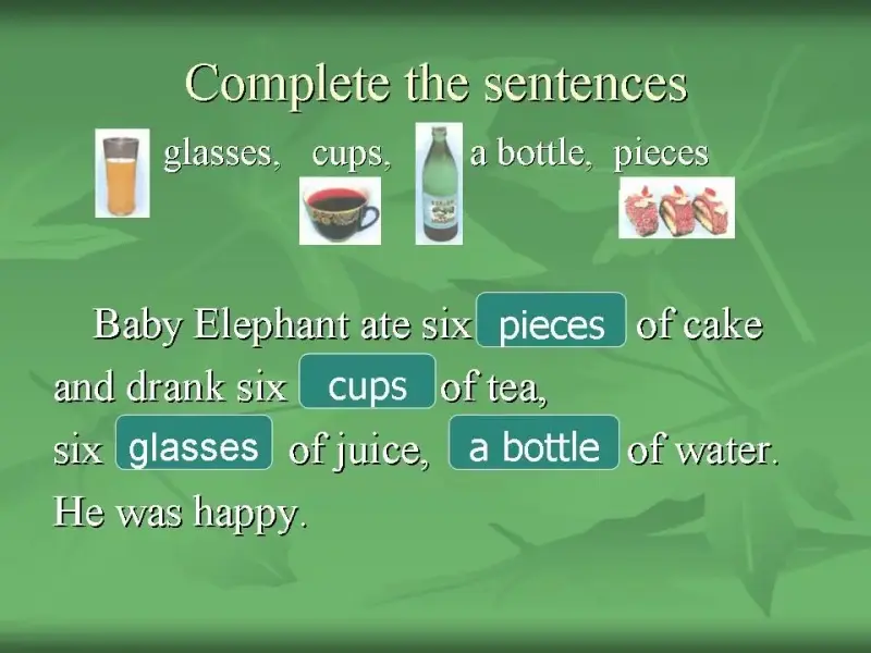 Baby Elephant ate six ... of cake and drank six ... of tea, six ... of juice, ... of water. He was happy.