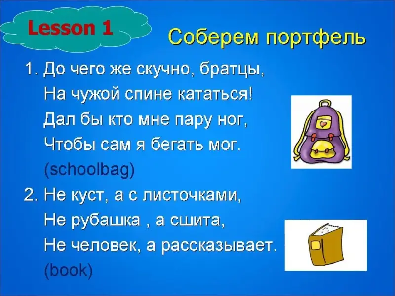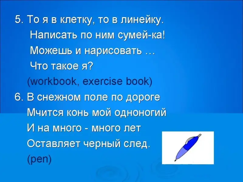 (Примечание: в слабом классе загадки даются на русском языке, а слово назвать по-английски)