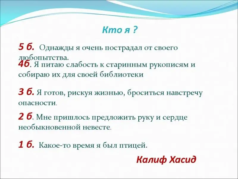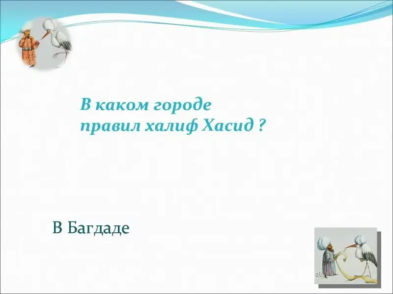 1. В каком городе правил халиф Хасид? (В Багдаде)