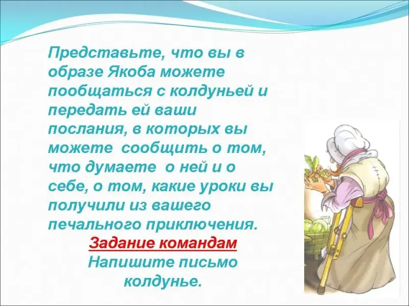 Представьте, что вы в образе Якоба можете пообщаться с колдуньей и передать ей ваши послания, в которых вы можете сообщить о том, что думаете о ней и о себе, о том, какие уроки вы получили из вашего печального приключения.