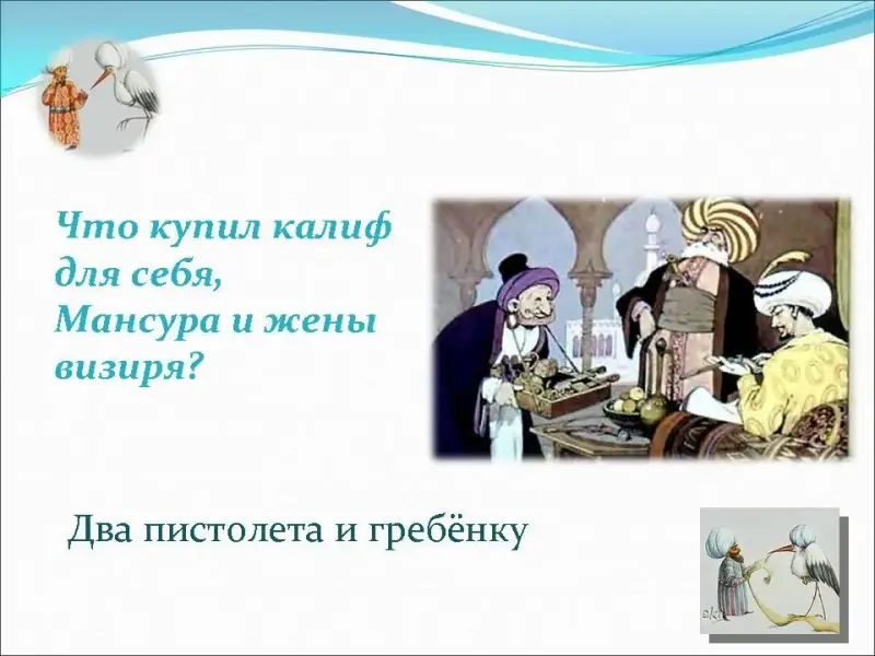 4. Что купил калиф для себя, Мансура и жены визиря? (Два пистолета и гребёнку)