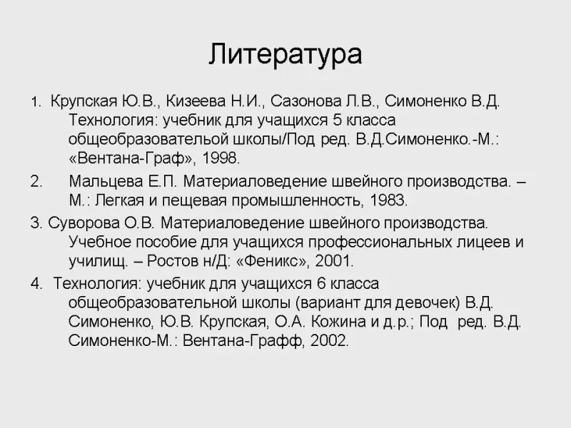 - Пармон Ф.М. Композиция костюма: Учебник для вузов. М.: Легпромиздат, 1997