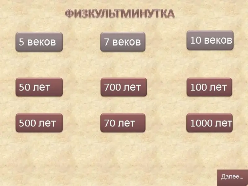 (Учитель называет события по "ленте времени", если они происходят до нашей эры - хлопок в ладоши над головой, в нашей эре - хлопок перед собой или внизу). |