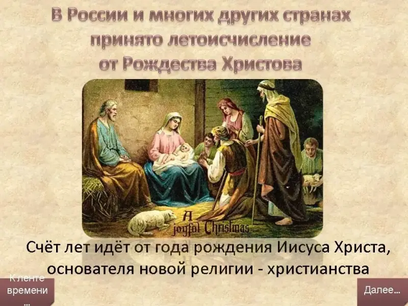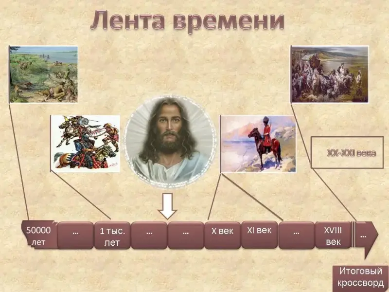 5 веков - это сколько лет? 7 веков - это сколько лет? 10 веков - это сколько лет? VI - это сколько? XX - Это сколько? XXI- Это сколько? (слайд 6) В России и многих других странах принято летоисчисление от Рождества Христова Счёт лет идёт от года рождения Иисуса Христа, основателя новой религии - христианства. (слайд 7) События, которые произошли после рождения Христа - наша эра. Какой сейчас идёт год? (2013). Значит, после рождения Христа прошло 2013 лет. Эта дата - наша эра. События из вашей жизни, отображенные на фото, в какой эре произошли? А какое это тысячелетие? То, что произошло до рождения Христа, договорились называть "до нашей эры". Считают так (учитель показывает примеры: 2 века до н.э., 3 века и т.д.) (Слайд 8) Сейчас мы рассмотрим основные события, которые произошли на Кубани и соотнесем их с лентой времени. Переход на 9 слайд осуществляется кликом на картинку (лента). (Слайд 9) |
