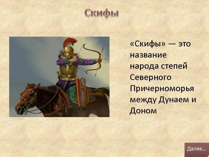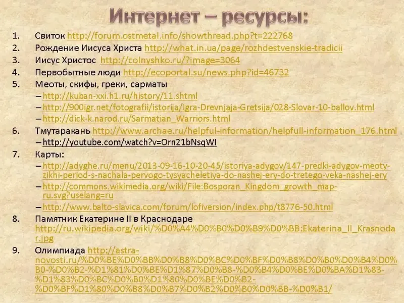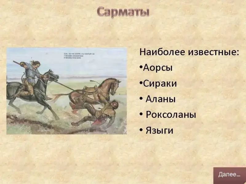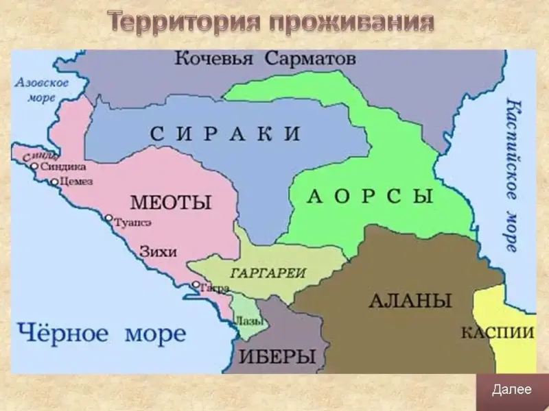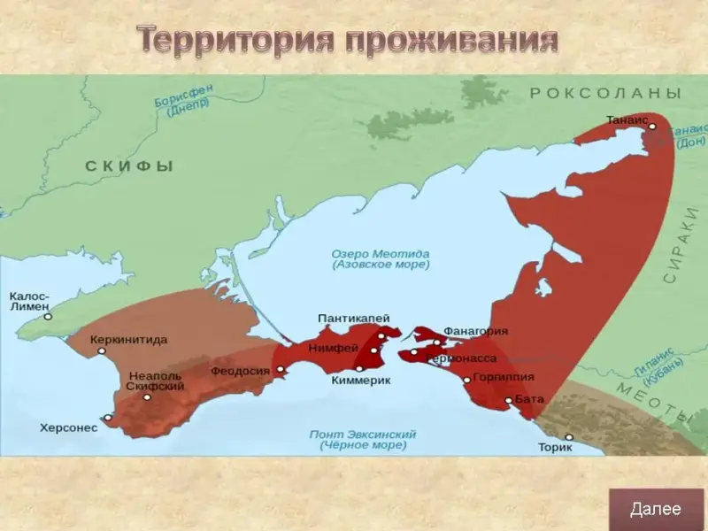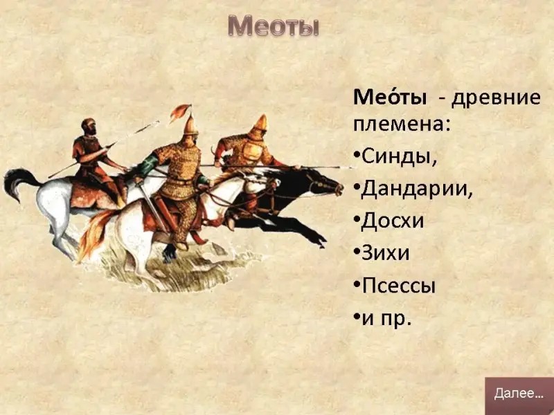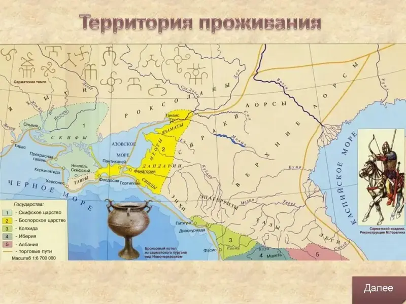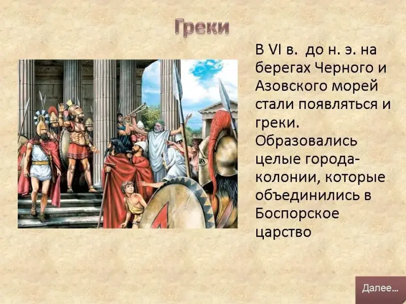 В первой половине I тысячелетия до н. э. степную часть территории края заселили кочевники - скифы и сарматы, а в Приазовье обитали оседлые земледельческие племена - меоты, находившиеся в тесных взаимоотношениях со своими соседями... (Слайды 11, 12) Переход на них - клик по кнопке "Меоты" Слово "меоты" означает "море, которое мутнеет" или "соленое болото", потому что жили они возле плавней, возле реки Кубань. Главным занятием было земледелие. Выращивали просо, рожь, ячмень, чечевицу, лен. Этому помогала река. Еще один вид занятий - скотоводство. Животные помогали пахать, навозом удобряли поля. Меоты были ремесленниками. Они умели плавить металл и изготавливать глиняную посуду. Жили они в круглых домах с соломенными крышами. Поселок окружали рвы и земляные валы с частоколами. В центре поселений была цитадель, где находилось жилище вождя, хранилось оружие и запасы продовольствия. Поселения располагались недалеко друг от друга, поэтому во время опасности сигналы подавались с помощью костра. Меоты воевали только тогда, когда на них нападали. (Можно просмотреть фильм, сделав клик на картинку, предварительно скачав видеофайл по ссылке) (возврат к слайду 10) (слайды 13, 14) Давайте познакомимся с жизнью САРМАТОВ. Основное занятие населения сарматов - кочевое скотоводство, воинское дело. У них не было домов, а кибитки, сделанные из войлока. Они прикрепляли их к повозкам, на которых и жили. Вокруг повозок пасся скот. Они научились очень хорошо делать шлемы и панцири из кожи волов. Еще одно их занятие было - сбор дани с соседних земледельческих племен, может быть, и меотов. Поэтому они очень большое значение придавали военной одежде и оружию. Когда сармата хоронили, в курганы, как скифы, клали одежду, деньги, украшения. Но перед захоронением они должны были разбить зеркало или зашить его в футляр. Они считали, что в зеркале отражается душа умершего. Еще сарматы верили в силу огня, поэтому в захоронениях встречаются курильни, дым которых освобождал от злых сил. Сарматов можно было узнать по внешнему облику: от морозов они защищались шкурами животных и сшитыми штанами. Только лицо у них было открыто, но и оно было защищено густой бородой. (Можно просмотреть фильм, сделав клик на картинку, предварительно скачав видеофайл по ссылке). Возврат к слайду 10. (Слайды 15, 16) Когда-то давным-давно на необъятных просторах Евразии от Причерноморья до Саяно-Алтая кочевали загадочные народы. Античные писатели и историки называли их "скифами". Под "скифами" понимались и племена, жившие только в районе Северного Причерноморья, и прочие народы, обитавшие на достаточно удаленных друг от друга территориях. Основное их занятие - война. (Можно просмотреть фильм, сделав клик на картинку, предварительно скачав видеофайл по ссылке). Переход по ссылке к слайду 10. (Слайды 17, 18) Рассказ о ГРЕКАХ. В VI в. до н. э. на берегах Черного и Азовского морей стали появляться и греки, создавая большие поселения (или колонии). Селились они рядом с местным населением, чтобы можно было с ним торговать. Основное занятие - торговля. На кораблях они торговали по всему побережью. В греческих городах обязательно строили храмы, в них были жрецы, приносились жертвы богам. Вокруг городов выросли виноградники. До сих пор они занимают много места на побережье, там, где жили греки. Постепенно греческие поселения стали образов